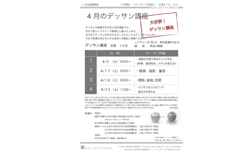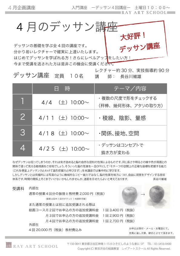 4月のデッサン4回講座が以下の日程で決定致しました。