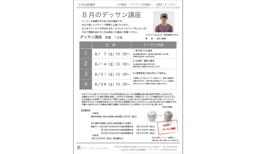 8月のデッサン4回講座が以下の日程で決定致しました。