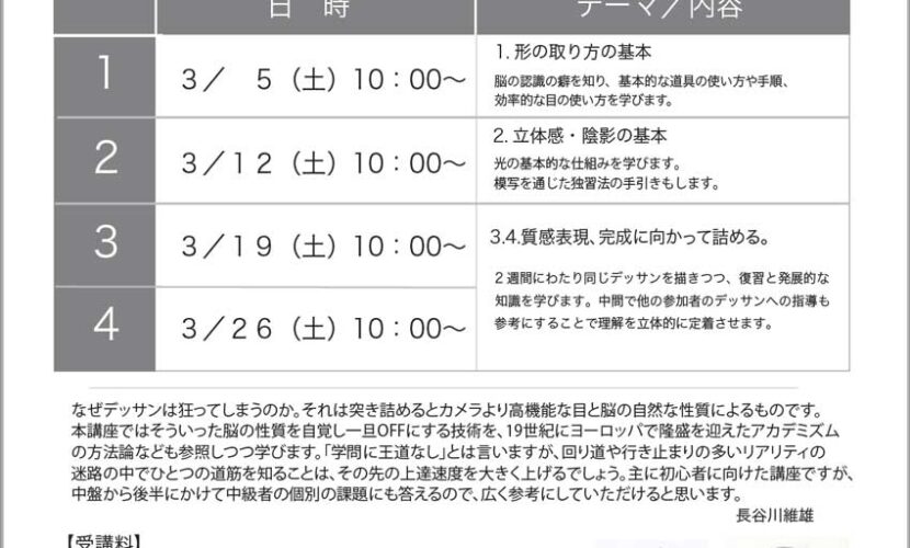 2022年3月のデッサン4回講座が以下の日程で決定致しました。